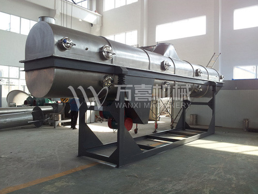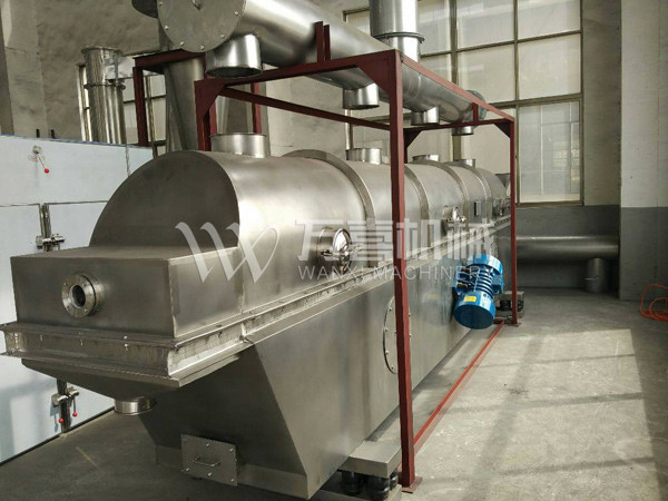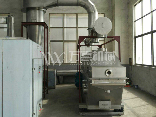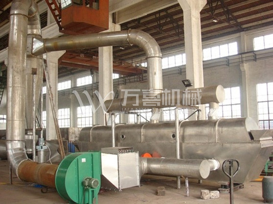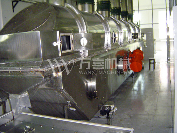 物料自進(jìn)料進(jìn)口進(jìn)入機(jī)內(nèi),在振動(dòng)力作用下,物料沿水平面流化床拋擲,向前連續(xù)運(yùn)動(dòng),熱風(fēng)向上穿過(guò)流化床同濕物料換熱后,濕空氣經(jīng)旋風(fēng)分離器除塵后由排風(fēng)1:3排出,干燥物料由排料進(jìn)口排出。