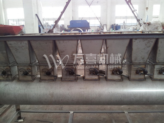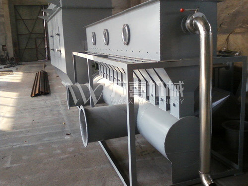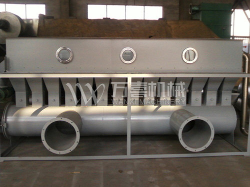 潔凈的熱風經(jīng)閥板分配進入床體內(nèi),從加料器進入的濕物料被熱風形成沸騰狀態(tài)。由于熱風與物料廣泛接觸,增強了傳熱傳質(zhì)的過程,因此在較短時間內(nèi)就可干燥。如用連續(xù)型,物料從床體的一頭進入,經(jīng)過幾十秒至幾分鐘沸騰干燥,自動從床體另一頭流出。本設(shè)備一般進行負壓操作。