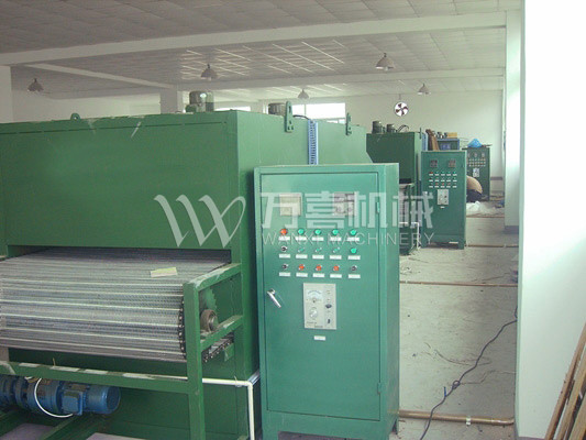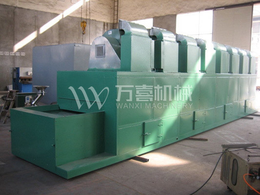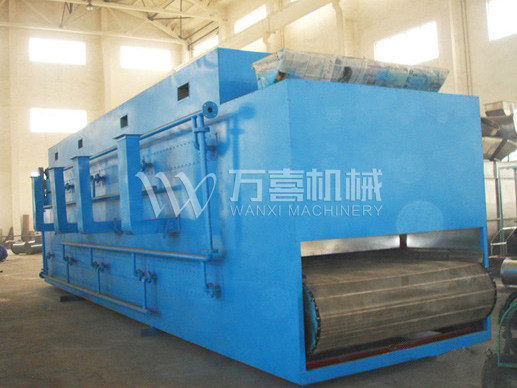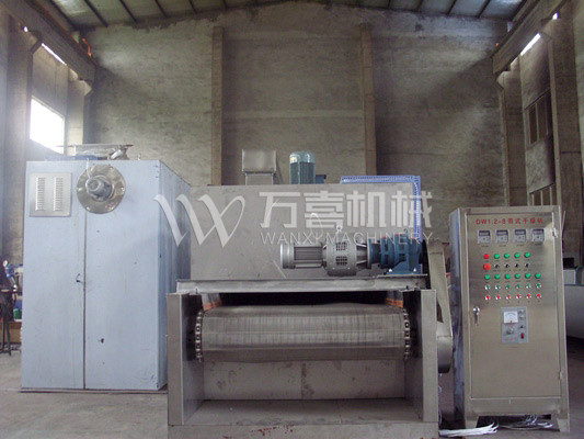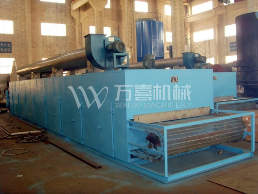 物料由加料器均勻地鋪在網(wǎng)帶上,網(wǎng)帶一般采用12-60目不銹鋼絲網(wǎng),由傳動裝置拖動在干燥機內移動。干燥機由若干單元組成,每一單元熱風獨立循環(huán),部分尾氣由專門排濕風機排出,廢氣由調節(jié)閥控制,熱氣由下往上或由上往下穿過鋪滿物料的網(wǎng)帶完成熱量與質量傳遞的進程,帶走物料水份。網(wǎng)帶緩慢移動,運行速度可根據(jù)物料溫度自由調節(jié),干燥后的成品連續(xù)落入收料器中。上下循環(huán)單元根據(jù)用戶需要可靈活配備,單元數(shù)量亦可根據(jù)需要選取。