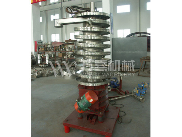 濕物料自頂部加料口進(jìn)入螺旋床內(nèi),在周向激振力及重力的作用下,物料沿螺旋床自上而下作跳躍運(yùn)動直至最底層;同時(shí),潔凈的熱風(fēng)由螺旋床底部進(jìn)入,與分布在床上的物料進(jìn)行充分的傳熱和傳質(zhì)后,由頂部排濕口排出。從而使物料達(dá)到了干燥的目的。