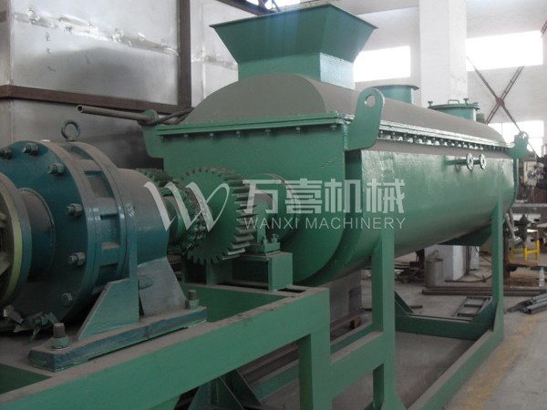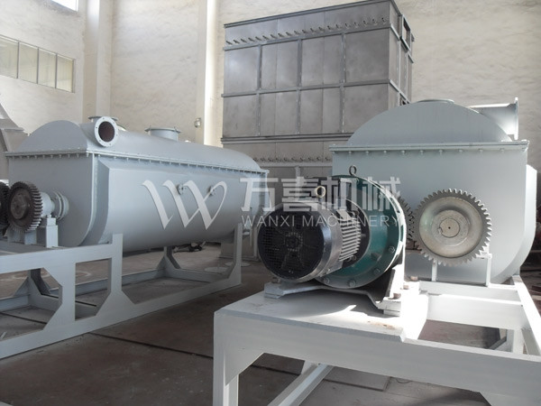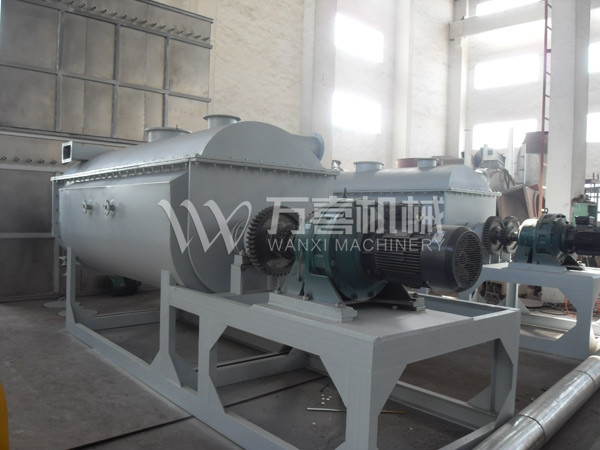 空心軸上密集排列著楔型中空漿葉,熱介質(zhì)經(jīng)空心軸流經(jīng)漿葉。單位有效容積內(nèi)傳熱面積很大,熱介質(zhì)溫度從-40℃到320℃,可以是水蒸汽,也可以是液體型:如熱水、導(dǎo)熱油等。間接傳導(dǎo)加熱,沒有攜帶空氣帶走熱量,熱量均用來加熱物料。熱量損失僅為通過器體保溫層向環(huán)境的散熱。楔型漿葉傳熱面具有自清潔功能。物料顆粒與楔型面的相對(duì)運(yùn)動(dòng)產(chǎn)生洗刷作用,能夠洗刷掉楔型面上附著物料,使運(yùn)轉(zhuǎn)中一直保持著清潔的傳熱面。漿葉干燥機(jī)的殼體為Ω型,殼體內(nèi)一般安排二到四根空心攪拌軸。殼體有密封端蓋與上蓋,防止物料粉塵外泄而充分發(fā)揮作用。