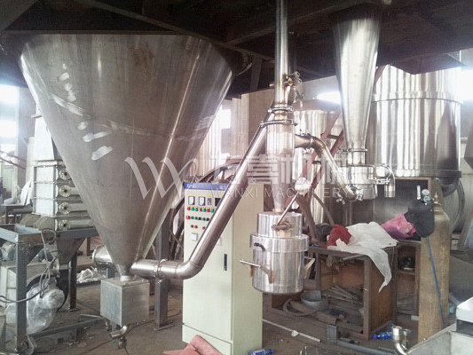 該機(jī)采用全封閉形式,所有部件均采用不銹鋼制造,配有三級(jí)凈化裝置,過(guò)濾后的空氣達(dá)十萬(wàn)級(jí)要求。筒體與頂部裝有冷壁裝置,使壁溫<80℃,干燥塔內(nèi)裝有氣刷掃塔裝置。經(jīng)該機(jī)干燥后的中藥浸膏粉,不會(huì)出現(xiàn)焦化變質(zhì)現(xiàn)象,大大增加了收粉率(95%以上),而且不會(huì)產(chǎn)生混藥現(xiàn)象和粘壁現(xiàn)象。
